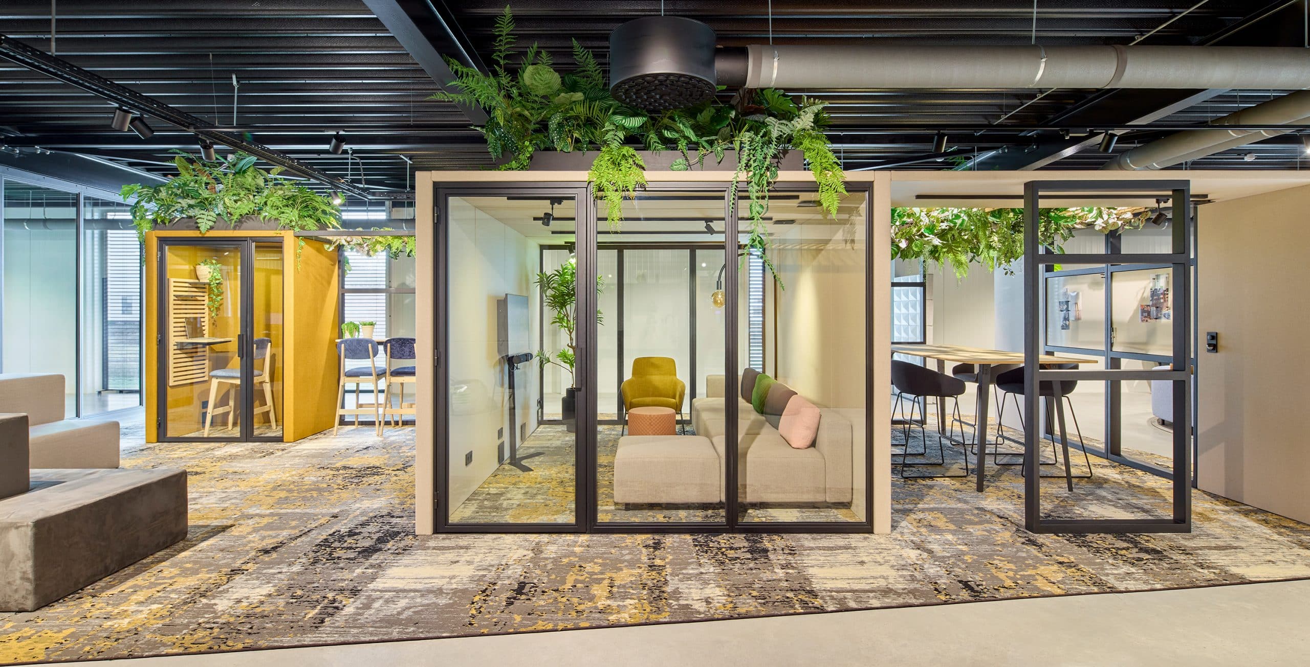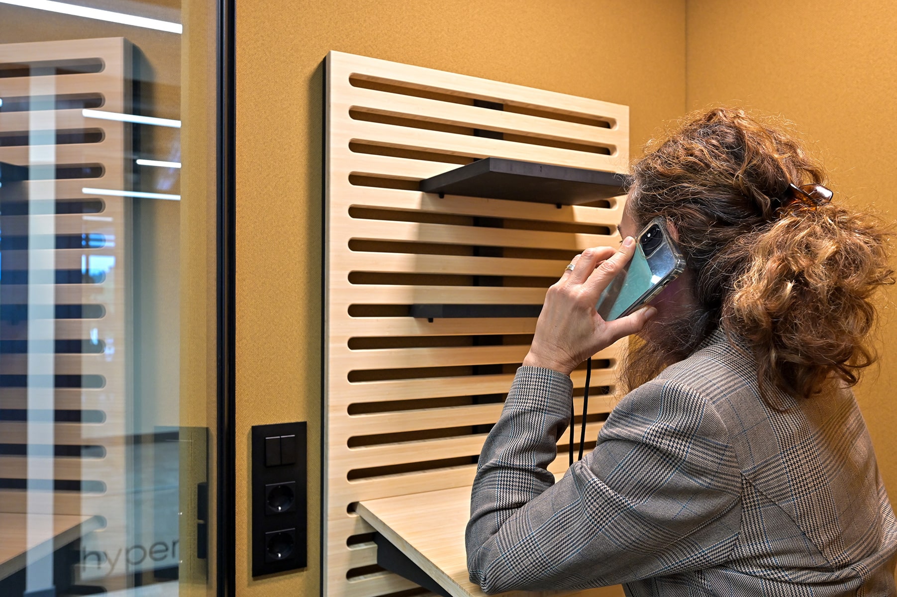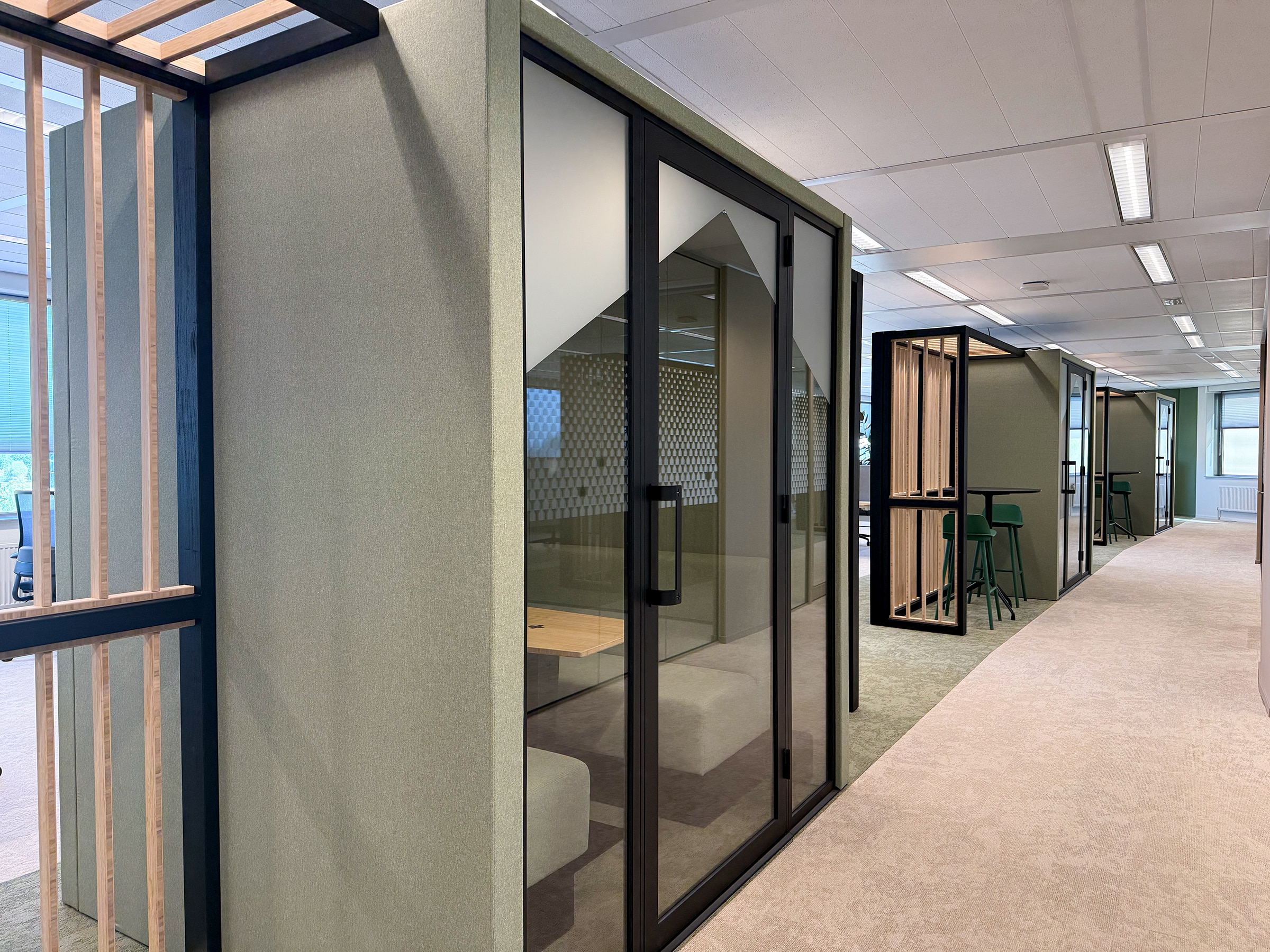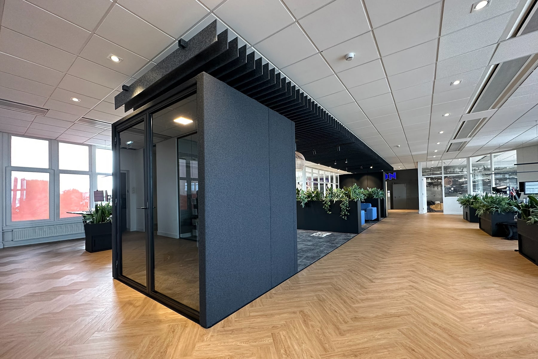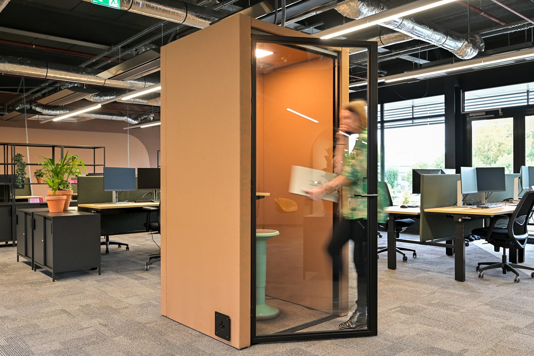 M+ Rooms are modular spaces that can be configured as video call booths, focus rooms, or meeting rooms. They are constructed from modular acoustic walls, ceilings, and glass panels. Each M+ Room is designed and manufactured in the Netherlands using sustainably certified wood, high-quality recycled acoustic insulation, and finished with a durable fabric of your choice.