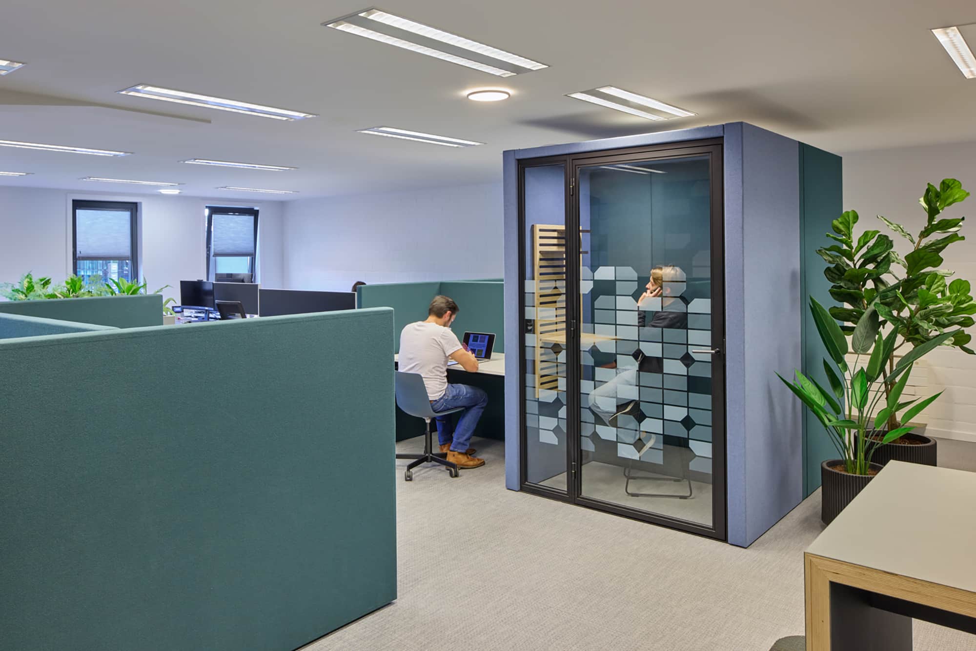 • Overall: A Phonebooth+ contains 77.5% acoustic elements and 22.5% glass. Together, this delivers an average Rw value of 38 dB, which translates to an effective noise reduction of 35 dB after accounting for spatial factors.